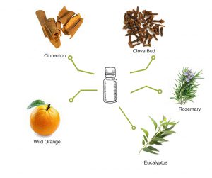 ワイルドオレンジ(皮)、クローブ(つぼみ)、シナモン(木の皮/葉)、ユーカリプタス(葉)、ローズマリー(葉/花)の精油